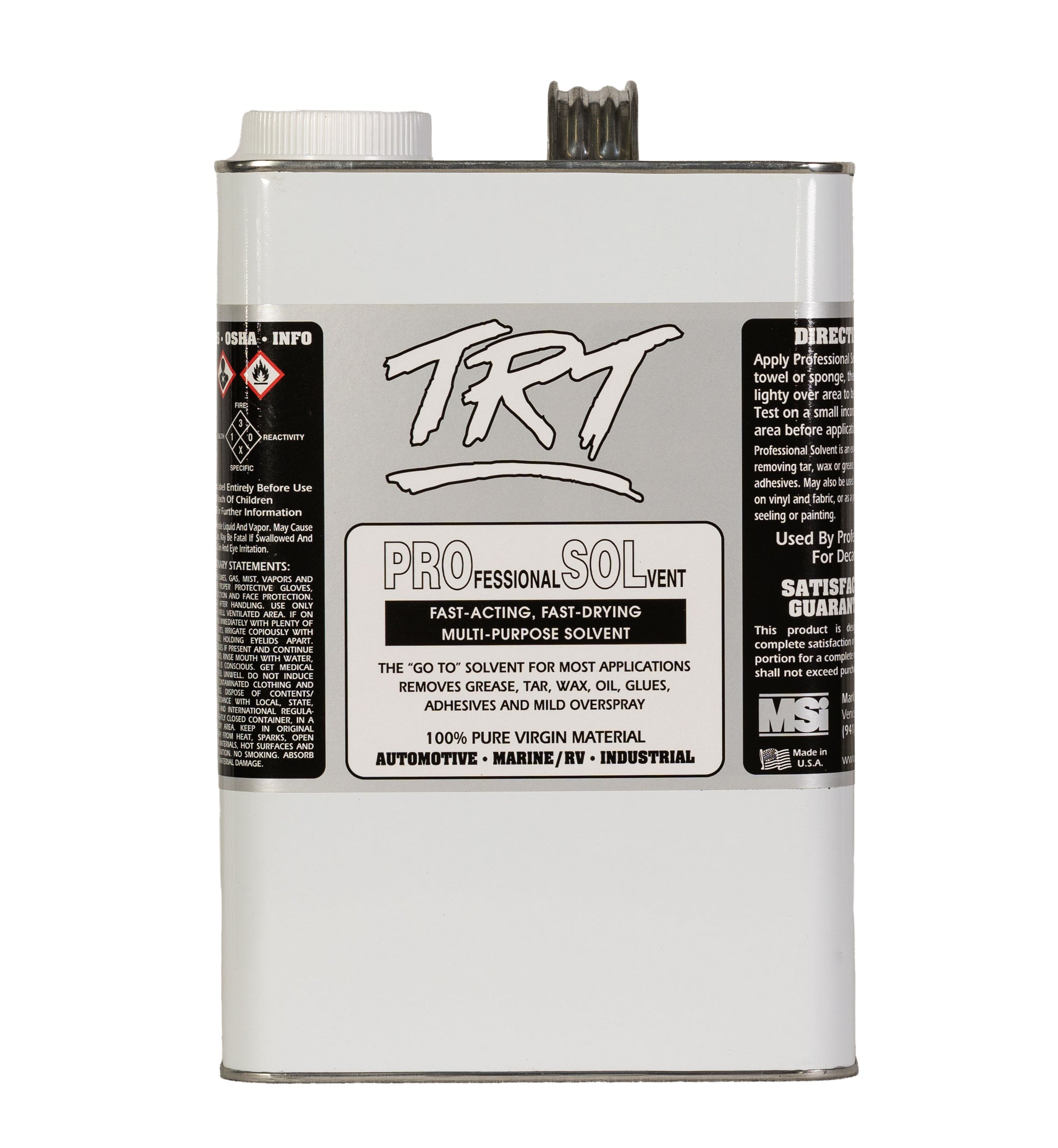 TRT Pro Sol is a professional-grade, fast-acting solvent designed for a wide range of automotive, marine, and industrial applications. Formulated with 100% pure virgin material, Pro Sol delivers powerful cleaning performance while flashing quickly for efficient, residue-free results.